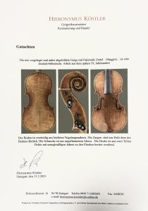Diese Geige ist eine italienische Arbeit von Luigi Montevecchi in Cesena gebaut. Boden: zweiteilig, aus einer schön geflammtem Ahorn. Decke: zweiteilig, aus Holz mit prägnanten Jahren mit Gutachten von Geigenbaumeister Hieronymus Köstler in Stuttgart.