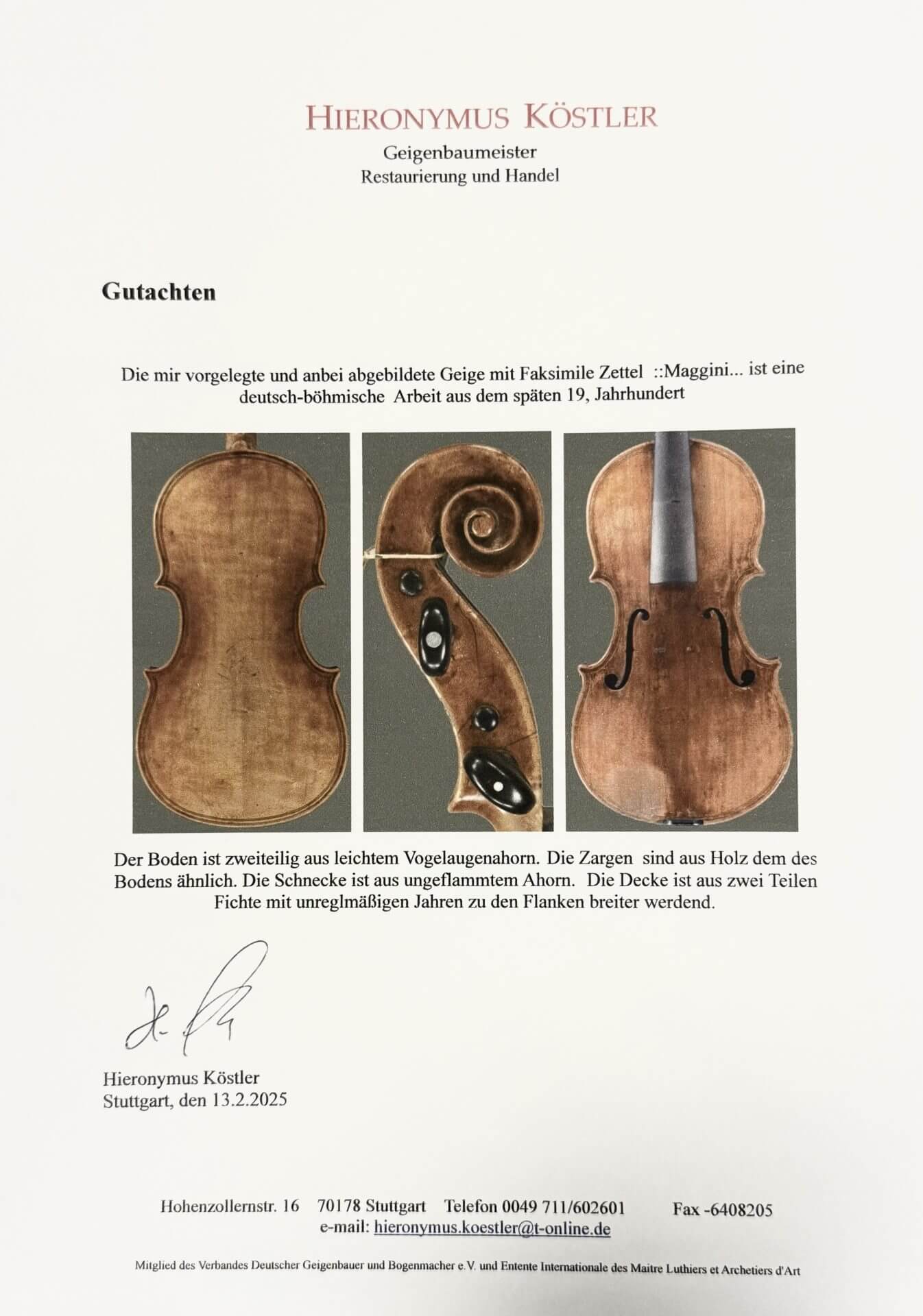 Diese ausdrucksstarke Geige stammt aus dem deutsch-böhmischen Raum und wurde vermutlich im späten 19. Jahrhundert gefertigt. Das Instrument orientiert sich stilistisch am Modell von Giovanni Paolo Maggini, was sich in den charakteristischen Proportionen und der kraftvollen Erscheinung widerspiegelt.