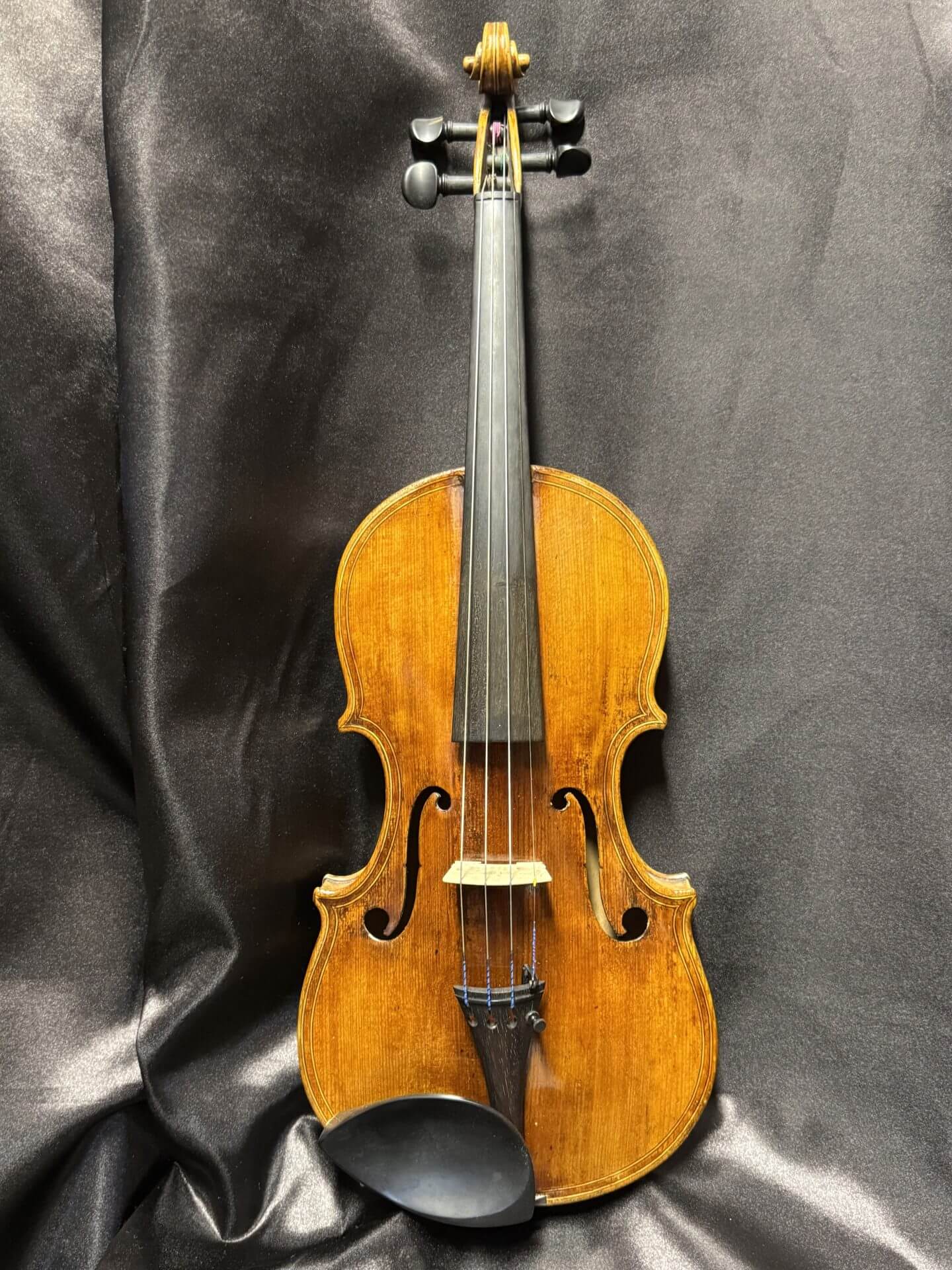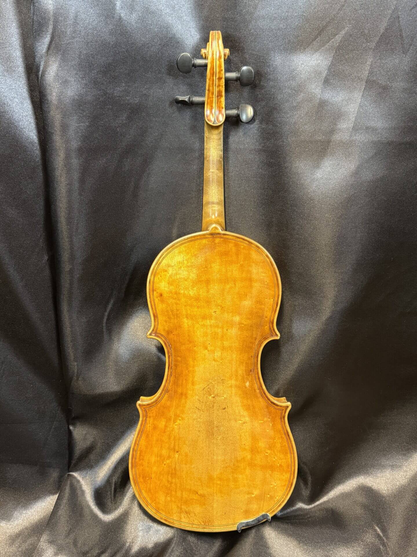 Der goldbraune Lack besitzt eine lebendige Tiefe und betont die natürliche Struktur des Holzes. Altersbedingte Gebrauchsspuren sind vorhanden und verleihen dem Instrument zusätzlichen Charakter, ohne die Spielbarkeit zu beeinträchtigen.