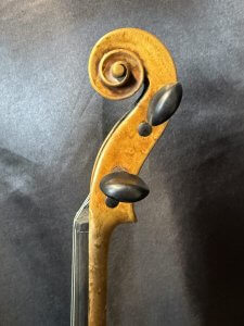 Die Decke besteht aus Fichte, während Boden und Zargen aus Ahorn gefertigt sind. Der zweiteilige Boden zeigt eine dezente Maserung, die dem Instrument eine warme und elegante Ausstrahlung verleiht. Die Schnecke ist sorgfältig gearbeitet und unterstreicht die handwerkliche Qualität dieser Geige.